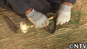 風乾後、鎌を地面に置き、刃を逆さにして玉ねぎの根と葉の部分を切る。