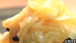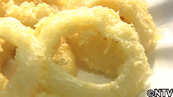 白玉ねぎを輪切りにし、衣をつけてさっと揚げたもの。塩をつけて食べる。熱を加えているため生の時より遥かに甘くなる。