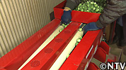 徐々に間隔が広くなるローラーがついており、S、M、L、2L、B級品ごとに分けていくことが出来る。品質を維持するため、選別を厳しくやっているという。