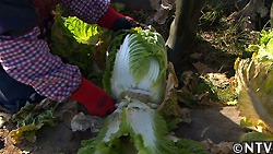 白菜は霜が降りると、外側の葉からどんどん枯れて垂れ下がってしまうので、それを防ぐ為に通常1個ずつアタマの部分をヒモで結び、外側の葉だけを犠牲にして中の葉を守る。