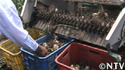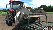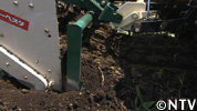 茎が切られたニンニクを土ごと掘り起こし、柔軟なローラーの回転によって土を払い落としながらニンニクを自動的にカゴへ収めていく。