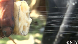 とれたてのレンコンを割ると、細かい糸が出てくる。これは、ムチンという、糖類とたんぱく質の複合体からなる粘性物質。