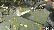 水堀りはくわを使わず、用水路から水を汲み上げ、ホースから勢いよく水を出してレンコンのまわりの土を吹き飛ばす方法。