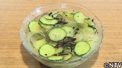 - きゅうり3本分をスライスし、だし汁に入れる。