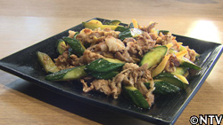 - 豚肉を強火で炒め、肉の赤みが消えたらきゅうりを入れさっと炒める。