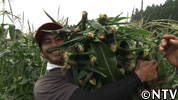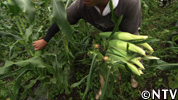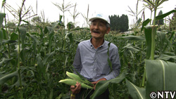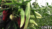 →研修生の一人、デヴィ君は片腕に40本のとうもろこしを持つ事が出来る。とうもろこしが1本、およそ500gなので、重さとして20kgになる。