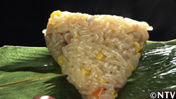 - 熊笹の葉で包み、蒸し器で15分蒸す。