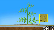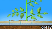 ナノサイズの穴からはわずかな水分しか通らないため、トマトは身の危険を感じ、行きのびようとして、必死にフィルム上に根を張らして、養分や甘みを溜め込み、美味しいトマトができる。
