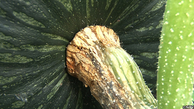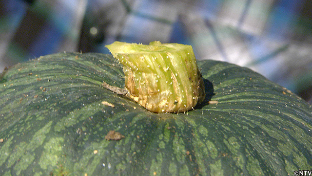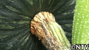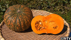 25日間の、かぼちゃにとって過酷な熟成期間を経たものは、余分な水分が飛び、実が凝縮されるので、皮の薄い所からオレンジの色素が表面に浮かびあがる。