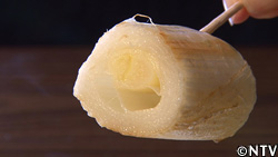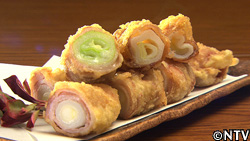 - 天ぷら粉と水で作った衣をからめ、170度の油でじっくりと揚げる。