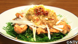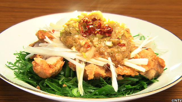 - ネギの緑の部分の千切りを皿に敷き、その上に、食べやすい大きさに切った肉→ネギの白い部分の千切り→ネギのタレをのせ、仕上げに鷹の爪を乗せて完成。