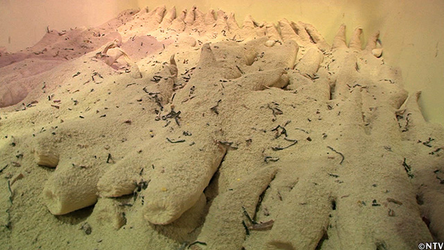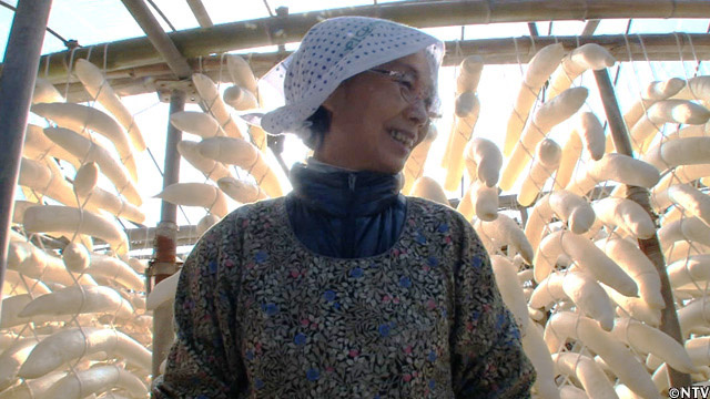サメのギザギザな皮を使って洗うことで、大根の表面にわざと傷をつける。そうすることで、そこから水分が抜けやすくなり、大根を干した際に乾きやすくなる。