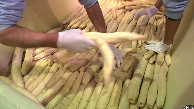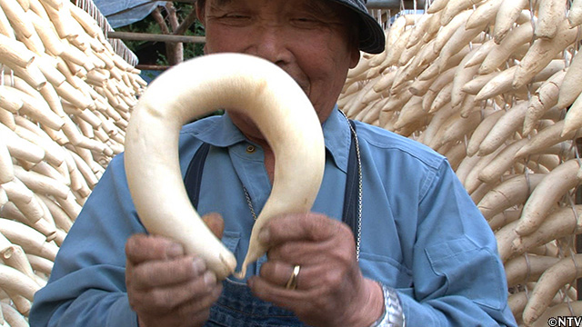 2週間ほど干すことによって、元々95%近く含まれている水分を60%ぐらいまで落とし、手に持ってクネクネと曲がるほど柔らかくなれば最適な干し加減。