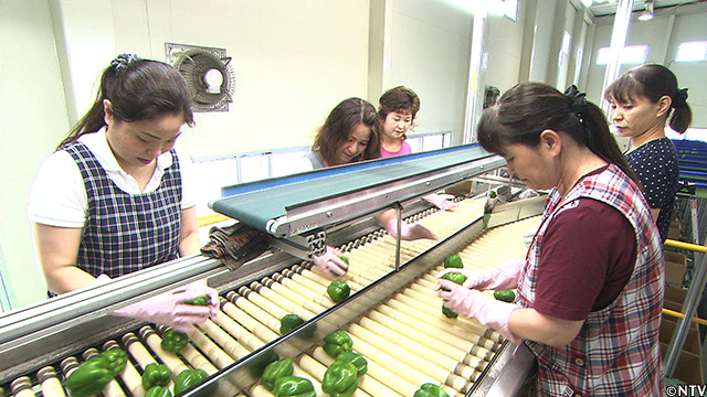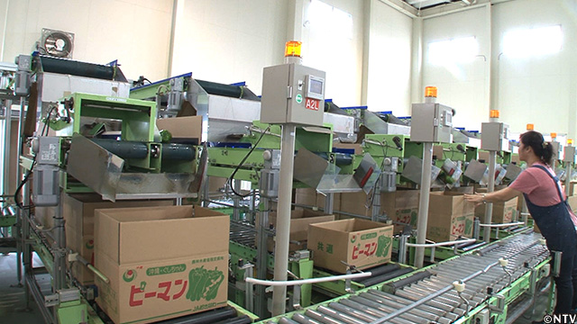 運ばれてきたピーマンは、一番初めに手作業で出荷できるものと、出来ないものに分ける。