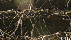 - コンベアで運ばれながら土や葉や茎を分離。
