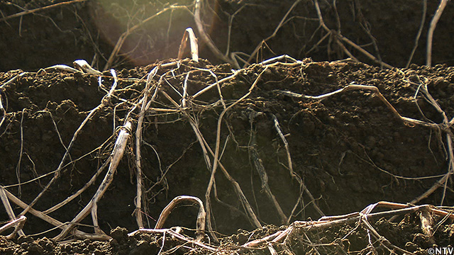 - 機械下部の3本のショベルで、イモを土ごと掘り上げる。