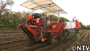葉が枯れたら、(ポテト)ハーベスタという収穫機を、トラクターでけん引して収穫する。