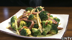 (2)に(1)と薄口醤油、塩コショウお好みで鶏ガラスープを入れて味を整えた後、蒸した花蕾を1株分入れて、炒めたら完成。