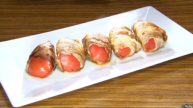 - 豚肉がはがれないように端に小麦粉をつけ、(1)のトマトを巻く。