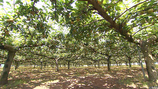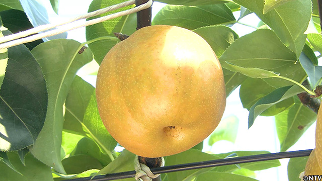 そのため、枝や葉が綺麗に揃い、太陽の光が均一に当たるので、梨1つ1つがバラつきなく、全てが均等な味の美味しい梨に育つという。