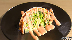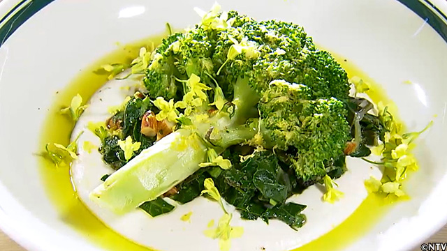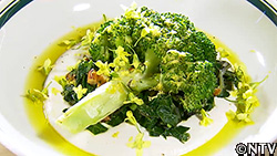 ブロッコリーの若い葉を細かく刻み、アーモンド、パセリ、オリーブオイル、レモン汁を混ぜる。