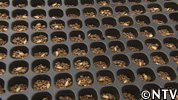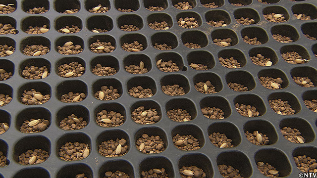 直径およそ1cmほどの穴が300個ほど空いた育苗箱に一粒ずつ蒔く。
