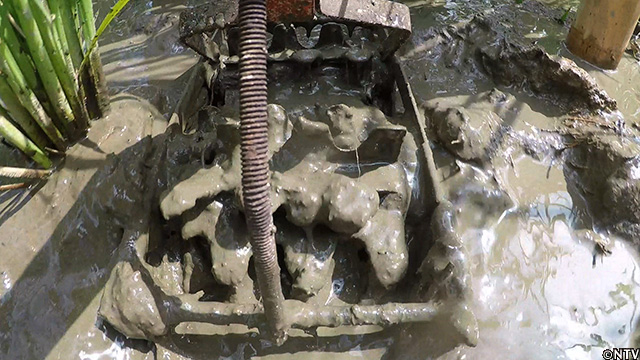 先端に付いたギザギザの車輪で、田んぼの中を進むことで、根を切って生育を促したり、草を取り除いたり、土中の有害なガスを抜いたりする効果があった。
