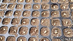 口径およそ2cmほどの穴が300個ほど空いた育苗箱に一粒ずつ蒔く方法。