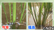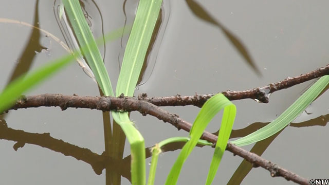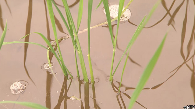田んぼを覆っている大きな木から落ちてくる枝によって茎が折れてしまっていた。