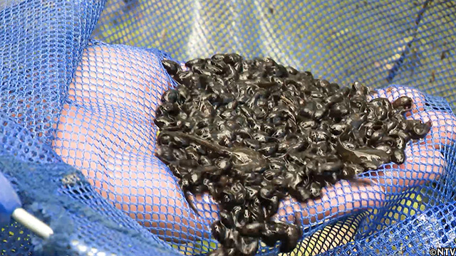 メスが泡状の分泌液を出し、卵を生み付ける。するとそこに雄が群がり受精。