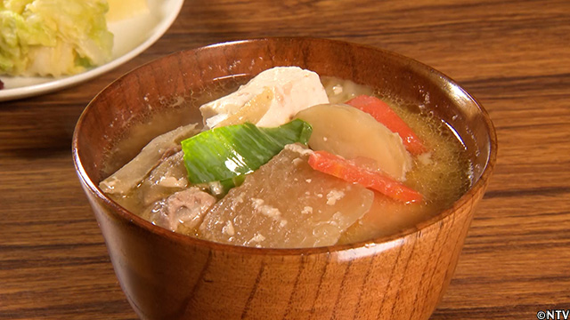 ショウガやニンニクがたっぷり入ったDASH村特製の豚汁。