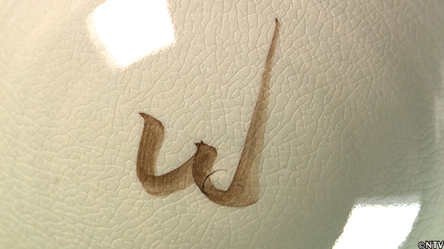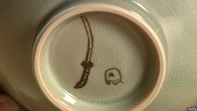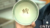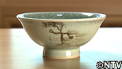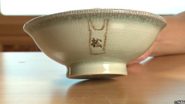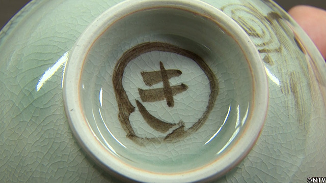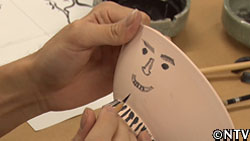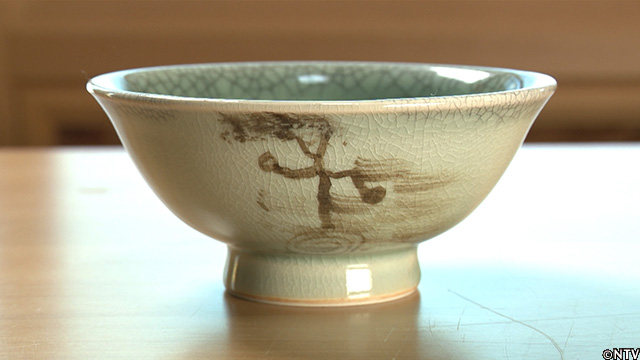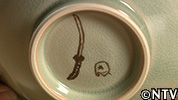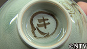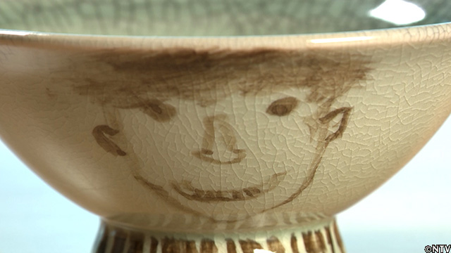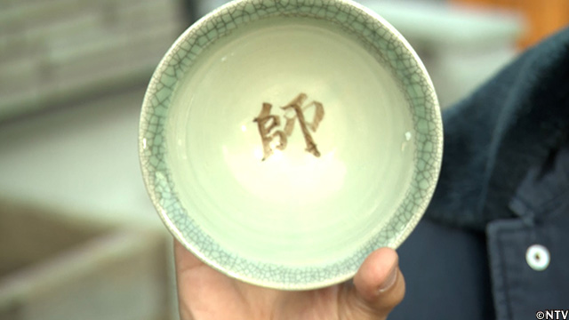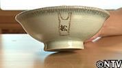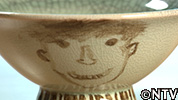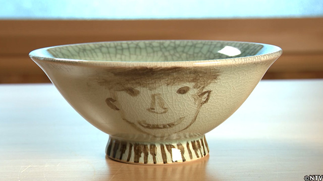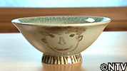 太一の似顔絵と鍵盤が描かれている。茶碗の底には師匠の「師」の文字が。