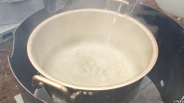 塩水選ができるよう、シンタローは城島のアドバイスのもと海水を大鍋で煮込んで、塩分濃度を濃くしていく。