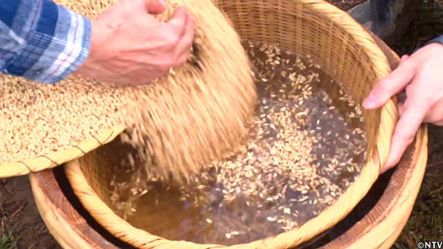 2023年の塩水選で通常よりも濃い濃度で行い、より中身の詰まった良い種を選出した岸の特別米。