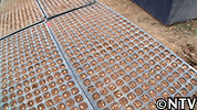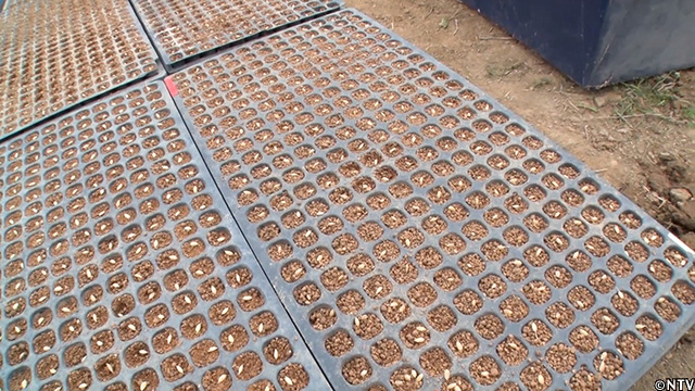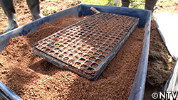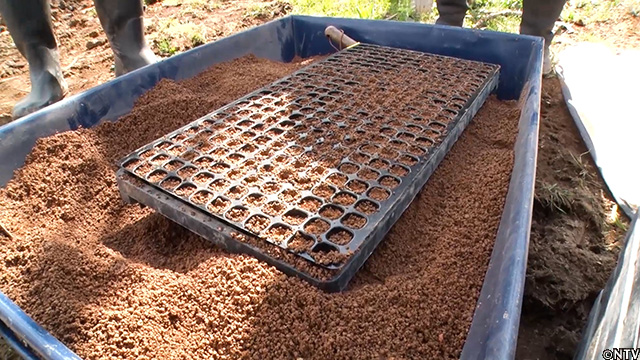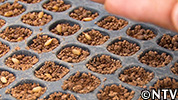 口径およそ2cmの穴が288個空いた育苗箱に一粒ずつまく方法。