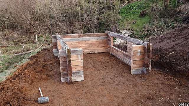 土台の小屋部分は横ログを組み立て、屋根となるビニール部分は竹を骨組みにして覆った。