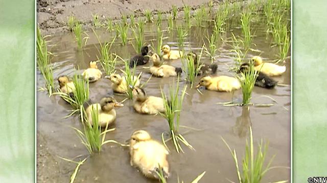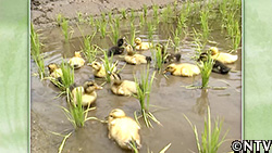 水田にアイガモを放し飼いして、雑草や害虫を食べてもらう。