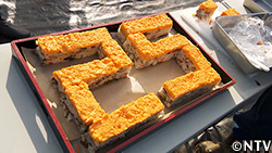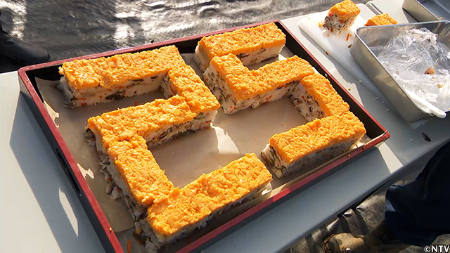ちらし寿司を押し寿司の型に詰め、上から押す。