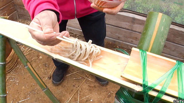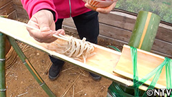 今回は、流しそうめんの要領で竹で作った水路に蕎麦を流して、ホフマンさんをおもてなし。