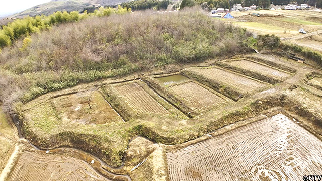 30年以上作付けが行われていなかった、草木が生い茂る7段の元棚田を地元の皆さんの手助けを受け、4枚の田んぼに復活させた。