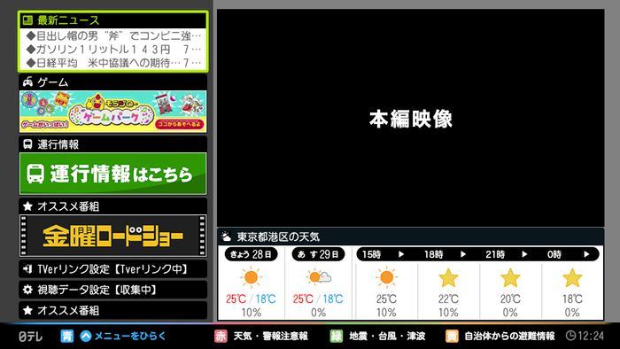 非連動データ放送とは、地上デジタル放送対応テレビにて、日テレを選局し、リモコンの【d】ボタンを押すと、24時間いつでも見ることができるコンテンツです。