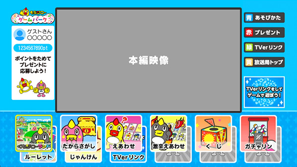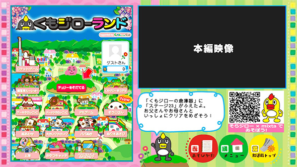 リモコンの【d】ボタンを押し、データ放送の「ゲーム」メニューを選択すると「えあわせ」や「宝探し」などのゲームや、「倉庫番」「上海」など懐かしの名作ゲームも楽しめる「くもジローランド」をお楽しみいただけます。