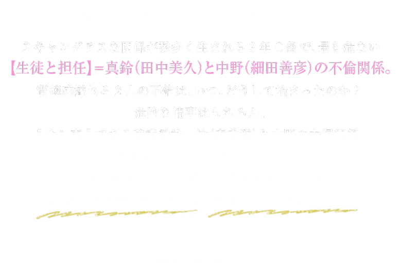 禁断の生徒と教師の不倫関係を、中野(細田善彦)目線で描く物語。中野はなぜ妻の怜(森香澄)を裏切り、生徒の真鈴(田中美久)に手を出してしまったのか?情事を楽しむ気持ちにも、やがて陰りが…そして、待ち受ける不倫の代償とは…!?