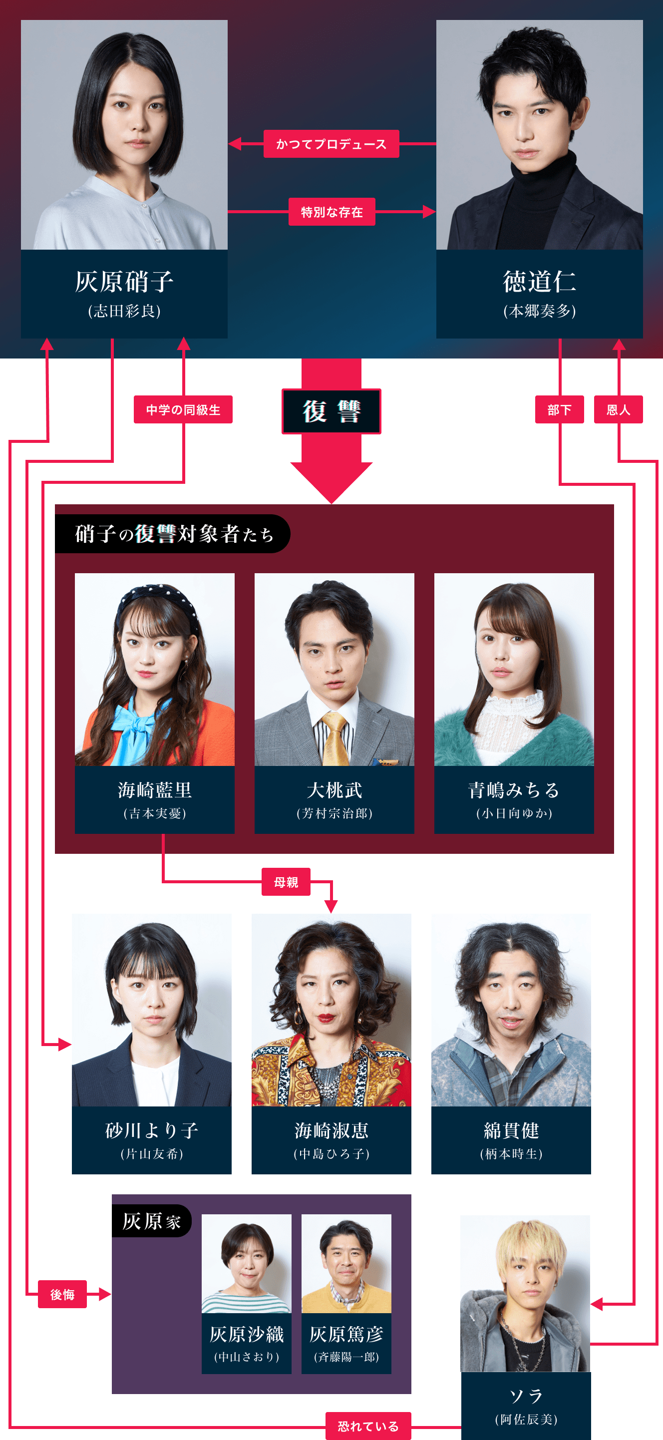 平凡な女子高生だったが、美容系配信者「徳道仁」のプロデュースによって、ファッション誌に出るなど一躍有名に。しかし同級生たちの悪意により、暴行動画とともにデマをネットで拡散され炎上。炎上した事件の後は引きこもり続けていたが、偶然テレビ中継で自分を苦しめた同級生たちが楽しそうにしているのを見て、あらゆる手を使い復讐をすることを決意する。