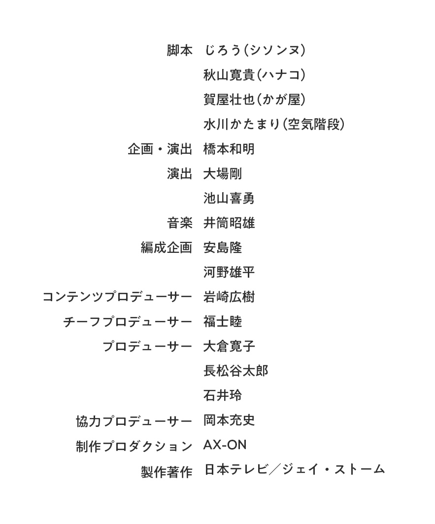 こんにちは。空気階段かたまりと申します。今回初めてドラマの脚本を書かせていただいたので今後は職業欄には脚本家と書きます。スタッフの皆さんがふざけて僕のことを「先生」と呼んでくださったのですが、心底気持ちよかったです。これからもいっぱい「先生」と呼ばれるように頑張って偉くなろうと思います。