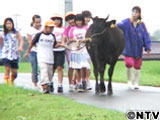 ![]() 牛を散歩させる育子さんと子ども達 |