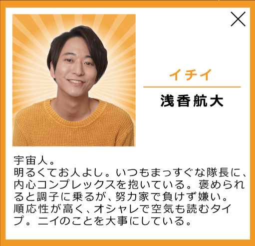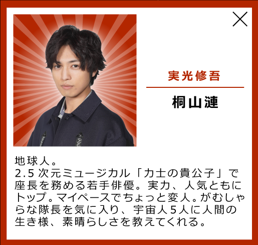修吾は地球人として宇宙人達に努力することの必要さや人間の美しさを教えていく、彼らに影響を与えていく役柄です。
