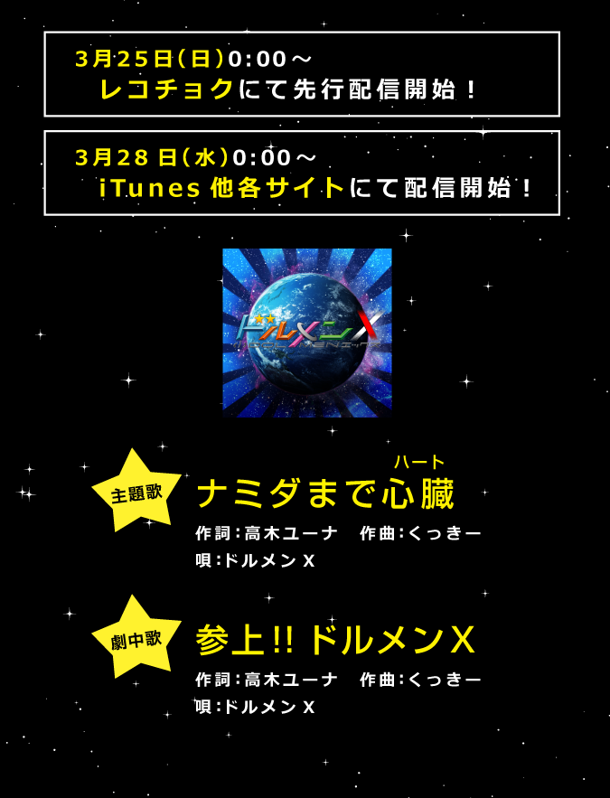 3月25日(日)0:00~ レコチョクにて先行配信開始!3月28日(水)0:00~ iTunes他各サイトにて配信開始!主題歌 ナミダまで心臓(ハート)作詞:高木ユーナ 作曲:くっきー 唄:ドルメンX。劇中歌 参上!!ドルメンX 作詞:高木ユーナ 作曲:くっきー 唄:ドルメンX