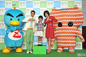 NTV program personality Hideyuki Nakayama, NTV campaign personality Seishiro Kato and NHK eco special program personality Norika Fujiwara pictured with eco characters.