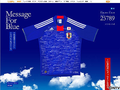 Imagine an oversized team uniform billowing in the supporter section of the stadium. If you post a message for the Japan National Soccer Team on the Internet, it will appear on the uniform. Go to https://www.ntv.co.jp/forblue or tweet your message on Twitter. (hashtag: #forblue)